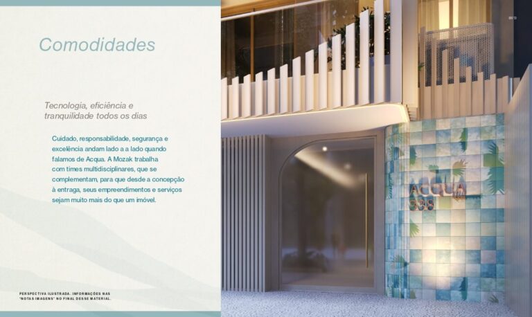 Por ser composto por imóveis menores, o Acqua Mozak pode ser um ótimo objeto de investimento. A construtora é minuciosa nos detalhes dos empreendimentos, apresentando imóveis com acabamentos em alto padrão, um aspecto que traz muita sofisticação e praticidade no cotidiano. Ainda é preciso chamar a atenção para os recursos de segurança e sustentabilidade utilizados no condomínio. Recursos tecnológicos como sistema de reaproveitamento de água, automação residencial, monitoramento por câmeras e alarmes de segurança são muito valorizados pelo conforto e tranquilidade que eles garantem para os moradores.