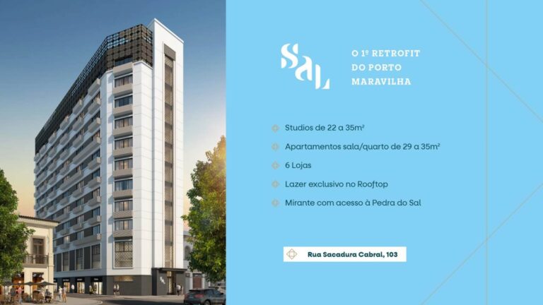 O lançamento residencial Sal Rio ocupa o antigo prédio do Chatô, na Pedra do Sal, no Centro do Rio. Ele será composto por 190 unidades, sendo 30 de apartamentos tipo e 160 studios com 1 quarto, com plantas sofisticadas que exibem metragens compactas, entre 23 e 35 m². O projeto contará ainda com alta segurança, estacionamento, área de lazer no rooftop e lojas no térreo.