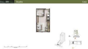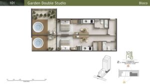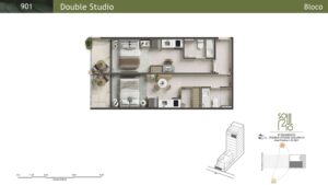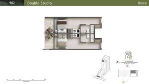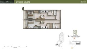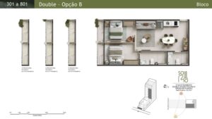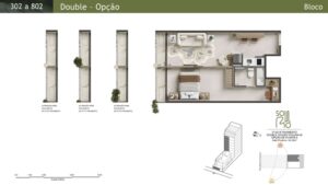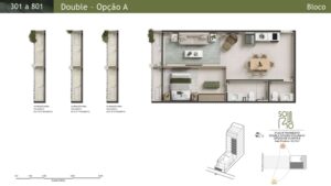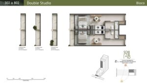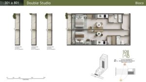 Double Studios: Com áreas de 44 m² a 52 m², essas unidades oferecem maior conforto e privacidade.